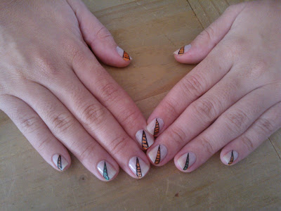 Primeiro pintam a unha com o verniz base transparente (como devem fazer sempre que vão pintar as unhas de qualquer cor, mesmo que seja só pintar as unhas com verniz vermelho devem primeiro passar com o verniz base). Em seguida, pintam metade da unha com um verniz e a outra metade com outro verniz (ponham uma boa quantidade de verniz para ser mais fácil misturá-los). Depois com um palito façam linhas curvas de um lado para o outro da unha. Por último, deixem secar e já está.
